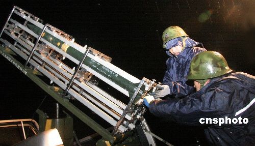 2月9日凌晨許,江蘇連云港市氣象局工作人員在該市陡溝鄉(xiāng)發(fā)射“人工增雨火箭彈”,進(jìn)行人工增雨。江蘇連云港市自去年入冬來(lái),遭遇罕見(jiàn)的無(wú)雨天氣,致使全市235.6萬(wàn)畝農(nóng)作物受旱較嚴(yán)重。當(dāng)?shù)貧庀蟛块T根據(jù)對(duì)降雨云系監(jiān)測(cè),決定在2月8日夜間至9日凌晨發(fā)射“人工增雨火箭彈”,進(jìn)行人工增雨。截止目前共發(fā)射“人工增雨火箭彈”32枚,全市普遍降雨量達(dá)到5毫米以上,望眼欲穿的“喜雨”終于從天而降,為久旱的大地送來(lái)了甘霖。 中新社發(fā) 王振 攝