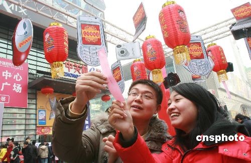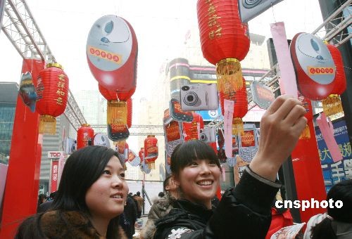 2月8日,人們在北京中關(guān)村競猜謎語。為迎接元宵佳節(jié),北京中關(guān)村舉行元宵燈謎會,用“電腦”、“相機”、“鼠標”、“手機”等造型懸掛的燈謎,吸引了不少市民駐足猜謎。中新社發(fā) 陳曉根 攝