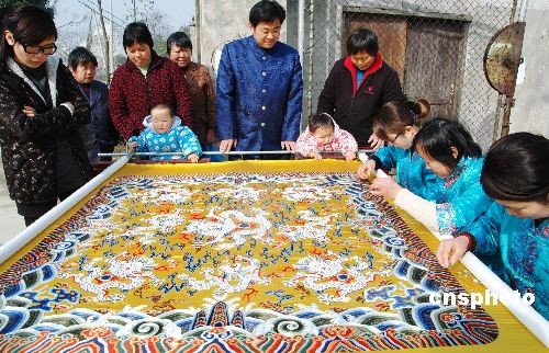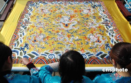 2009年2月10日,一幅長(zhǎng)117.5厘米、寬132厘米,使用了18萬(wàn)顆直徑1.3毫米珍珠“繡”制的《織繡串珍珠九龍皇墊》在蘇州高新區(qū)東渚鎮(zhèn)繡制完成。此作品由4個(gè)繡娘費(fèi)時(shí)7個(gè)月制作完成,在1.5米乘1.5米的手工云錦底布上,共使用了純金線(xiàn)3000米,真絲花線(xiàn)2000克和18萬(wàn)顆珍珠。中新社發(fā) 朱子寒 攝