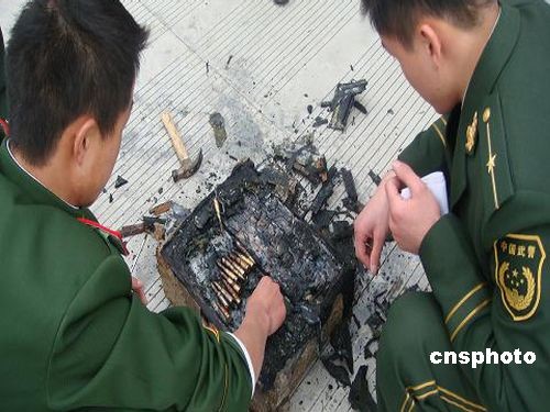 2月11日,浙江省蒼南縣炎亭邊防派出所民警下鄉(xiāng)走訪時(shí),遇見漁民陳某正在家門口用榔頭敲打一個(gè)表面裹滿了泥沙的木箱子,打開后發(fā)現(xiàn)有1000余發(fā)軍用子彈。據(jù)邊防民警介紹,這箱子彈保存較為完好,大約戰(zhàn)爭(zhēng)年代遺留下來(lái),是漁民陳某在2月10日出海作業(yè)時(shí)從海底打撈上來(lái)的,誤當(dāng)作稀有“古董”運(yùn)回家中收藏。目前,警方已依法對(duì)這箱子彈進(jìn)行了收繳。中新社發(fā) 吳水斌 攝