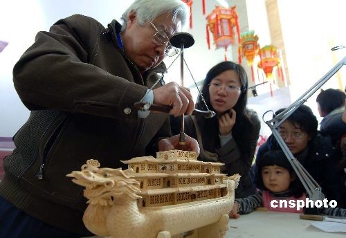 2月14日,在北京農(nóng)展館舉辦的“中國(guó)非物質(zhì)文化遺產(chǎn)傳統(tǒng)技藝大展”上,來(lái)自湖北武漢的木雕船模大師龍從發(fā),現(xiàn)場(chǎng)為北京觀眾表演用黃楊木制作龍鳳舟模型。中新社發(fā) 鄒憲 攝