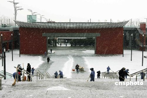 2月17日,北京迎來(lái)2009年第一場(chǎng)雪,奧林匹克公園的工作人員在清掃積雪,迎接游人到來(lái)。中新社發(fā) 陳曉虹 攝