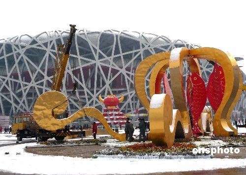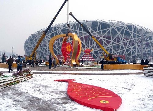 2009年2月19日,北京奧林匹克公園“鳥(niǎo)巢”與“水立方”之間,施工人員開(kāi)始拆卸“祥云皇冠”景觀(guān)。據(jù)悉,隨著牛年春節(jié)結(jié)束,其它春節(jié)臨時(shí)景觀(guān)也將陸續(xù)拆除。中新社發(fā) 玉龍 攝