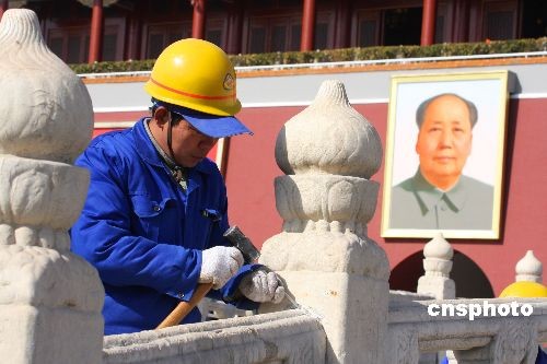 2月20日,工人正在對(duì)天安門金水橋進(jìn)行修繕。為迎接新中國(guó)成立60周年,確保游客和文物安全,從2月18日起,天安門金水橋開始實(shí)施保護(hù)修繕。據(jù)天安門地區(qū)管委會(huì)介紹,工程擬于5月1日前完工,然后整體對(duì)外開放。中新社發(fā) 吳芒子 攝