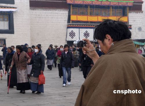 2月25日是藏歷土牛年正月初一,在布達(dá)拉宮、大昭寺等拉薩景點(diǎn),藏族人民正在用手機(jī)、數(shù)碼相機(jī)、DV等現(xiàn)代數(shù)碼產(chǎn)品通信、拍攝和錄制照片。中新社發(fā) 龍昊 攝