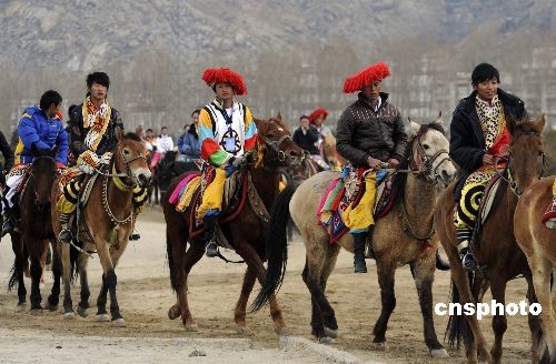 2月27日,中國藏歷年初三,拉薩賽馬場,傳統(tǒng)賽馬與表演活動開幕,參賽選手身穿傳統(tǒng)民族服裝亮相。中新社發(fā) 廖攀 攝