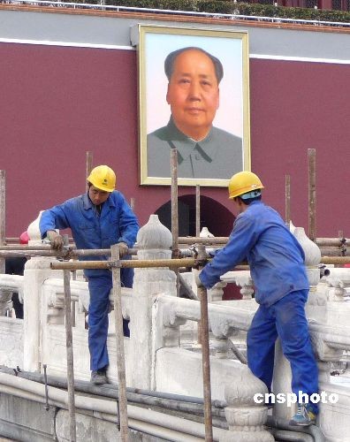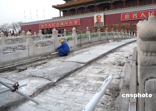 2009年2月26日,北京天安門金水橋上的施工人員正在搭建絞手架,為搭設(shè)圍擋及橋面鋪設(shè)青磚的工作做準(zhǔn)備。據(jù)悉,天安門金水橋修繕工程將全部剔除品級橋混凝土罩面,恢復(fù)傳統(tǒng)青磚。同時,在橋上架設(shè)棧道,棧道將滿鋪木板,能夠承受游人活動等所產(chǎn)生的荷載強(qiáng)度等。 中新社發(fā) 玉龍 攝