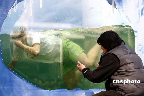 2月28日,“紅牛勇闖南北極”大型探險勇士招募活動開始在新春的北京舉行,應(yīng)募市民在活動中挑戰(zhàn)在冰水中憋氣。在北京站招募比賽中順利闖過三關(guān)、表現(xiàn)優(yōu)異者,將有機會前往北極極點探險!凹t牛勇闖南北極”大型探險勇士招募活動將在全中國海選出14位挑戰(zhàn)者,送往中國內(nèi)蒙古沙漠、瑞士阿爾卑斯冰川、挪威薩米人居住區(qū)等極地訓練營展開集訓,最終會有3人獲得挑戰(zhàn)北極點的最后通行證。而南極探險選拔活動將在下半年進行。中新社發(fā) 盛佳鵬 攝