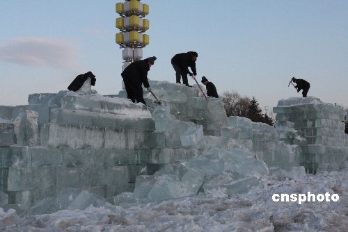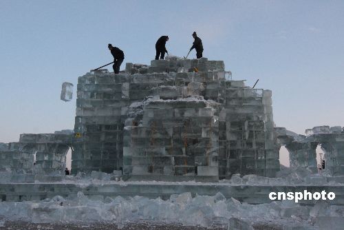 2月28日,施工人員在牡丹江市城區(qū)冰堡旅游景點(diǎn)拆除融化的冰雕作品。“立春”過后,素有“雪城”之稱的黑龍江省牡丹江市氣溫回升較快,城區(qū)內(nèi)的各大冰雪旅游景點(diǎn)的冰雪作品開始融化,失去寒冬里的風(fēng)采。從當(dāng)日起,城區(qū)冰雪旅游景點(diǎn)管理部門對(duì)融化的冰雕作品進(jìn)行拆除。中新社發(fā) 莊文斌 攝