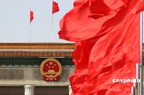 2009年3月1日,“兩會”即將召開,北京天安門廣場及周邊建筑掛起了紅旗,廣場上一片喜慶祥和氣氛。中新社發(fā) 魯谷 攝