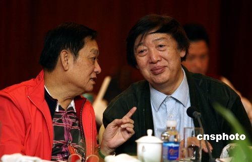3月4日,全國政協(xié)十一屆二次會(huì)議進(jìn)行小組討論,中國文聯(lián)副主席馮驥才和中國作協(xié)一級美術(shù)師韓美林在文藝小組上交流意見。中新社發(fā) 傅丹丹 攝