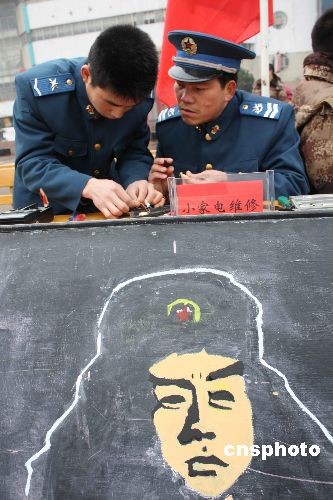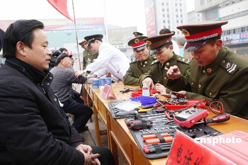 3月5日,青年志愿者在蚌埠火車站廣場參加“學(xué)雷鋒”獻(xiàn)愛心便民服務(wù)活動。當(dāng)日是全國“學(xué)雷鋒日”,共青團(tuán)安徽蚌埠市委舉行了“爭做志愿者、創(chuàng)造新生活”為主題的志愿服務(wù)統(tǒng)一行動,部隊、機(jī)關(guān)、學(xué)校、醫(yī)院、企業(yè)等二十多個單位組成多個青年志愿便民服務(wù)隊,深入駐地農(nóng)村、街道、社區(qū)、敬老院、兒童福利院等地,積極開展醫(yī)療巡診、法律咨詢、計生宣傳、心理咨詢、環(huán)保宣傳、家電維修、安全消防、用電知識等多種服務(wù)活動。中新社發(fā) 耿國慶 攝