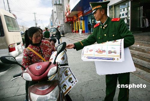 3月5日是中國“學(xué)雷鋒日”,西藏消防總隊的官兵在拉薩市北京中路向過往市民發(fā)放消防宣傳畫和講解消防知識。中新社發(fā) 劉震 攝