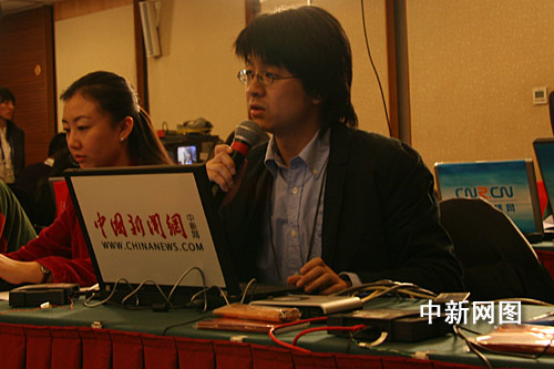 3月5日晚8時,“兩會”新聞中心邀請了5位出席十一屆全國人大二次會議的代表,與網(wǎng)民在線交流如何應(yīng)對國際金融危機的挑戰(zhàn)。圖為中新網(wǎng)記者代表網(wǎng)友向5位代表提問。中新網(wǎng)記者 吳博 攝