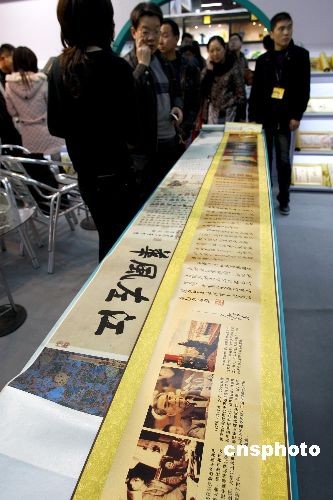 3月9日,第十九屆北京國(guó)際禮品工藝品暨家用精品展會(huì)在北京國(guó)際貿(mào)易中心開幕。本屆展會(huì)總面積達(dá)15000平方米,共有800多個(gè)展位,匯集了700多家參展商,適合不同人群的需求,讓市民可以體驗(yàn)一站式采購(gòu)的服務(wù)。圖為中華第一寶典“開國(guó)大典”絲綢工藝品長(zhǎng)卷亮相北京禮品展吸引不少市民的目光。中新社發(fā) 鄭雄增 攝