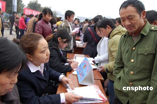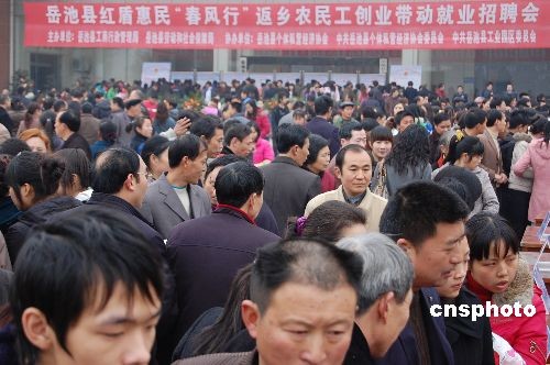 為解決農(nóng)民工就業(yè)難的問題,3月9日,四川岳池舉辦“紅盾惠民春風行”返鄉(xiāng)農(nóng)民工創(chuàng)業(yè)帶動就業(yè)招聘會,上萬名農(nóng)民工前往應聘。共有41個單位參與招聘,提供就業(yè)崗位3400余個。中新社發(fā) 胡佐斌 攝