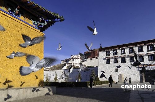 3月10日上午,西藏拉薩布達拉宮前群鴿飛翔,氣氛祥和。中新社發(fā) 廖攀 攝