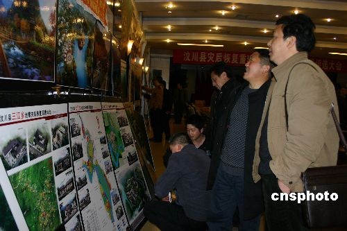 3月11日,為提高災后恢復重建規(guī)劃編制、建設項目單項設計的科學性和嚴謹性,充分發(fā)揮廣大城鄉(xiāng)規(guī)劃及建筑設計工作者的積極性和創(chuàng)造性,四川地震重災區(qū)汶川縣舉行“汶川縣災后恢復重建規(guī)劃設計優(yōu)秀成果評選活動”。全縣13個鄉(xiāng)鎮(zhèn)的恢復重建城市設計方案紛紛亮相,參與評比,征求專家及群眾意見。圖為公眾參觀設計方案。中新社發(fā) 霍潺 攝