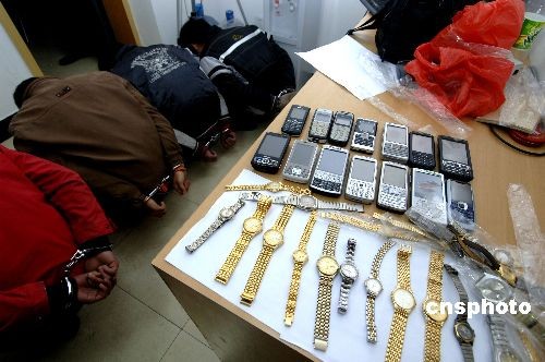 三月十二日,一伙盜竊分子在福州臺(tái)江刑偵大隊(duì)背對(duì)贓物,準(zhǔn)備接受審問(wèn)。福州警方近日破獲一起盜竊團(tuán)伙案,八名四川籍犯罪嫌疑人因撬開沿街商鋪盜竊名表、手機(jī)、電腦等貴重物品被捕。中新社發(fā) 王東明 攝
