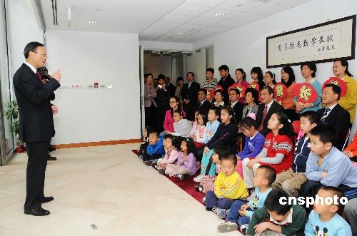 當(dāng)?shù)貢r(shí)間三月十二日,正在美國(guó)訪問(wèn)的中國(guó)外交部部長(zhǎng)楊潔篪來(lái)到中國(guó)駐美大使館視察中國(guó)250多家駐外使領(lǐng)館中的一所學(xué)!v美使館陽(yáng)光學(xué)校。楊潔篪在和學(xué)校孩子們交談時(shí)鼓勵(lì)他們學(xué)說(shuō)中國(guó)話,學(xué)寫中國(guó)字,學(xué)做中國(guó)人,并為陽(yáng)光學(xué)校題寫校訓(xùn):“愛(ài)國(guó)勵(lì)志勤學(xué)奉獻(xiàn)”。圖為楊潔篪在和陽(yáng)光學(xué)校老師和孩子們交流中。 中新社發(fā) 邱江波 攝