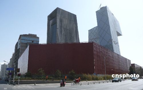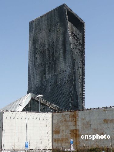 2009年3月13日,經過半個多月的施工,北京央視新樓北配樓火災現(xiàn)場旁的廣告牌搭建完畢,廣告牌已將央視北配樓部分樓體遮擋起來。中新社發(fā) 玉龍 攝