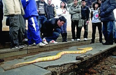 中新網(wǎng)3月15日電 湖南杜甫江閣北邊江邊趴著一條金黃色的蟒蛇,這條蟒蛇長約1.5米,有成年男子手臂那么粗,蛇皮呈金黃色,有些微微的腫脹,好像被水浸泡過,看上去似乎已經(jīng)死了,很多群眾自發(fā)地把現(xiàn)場保護(hù)起來。