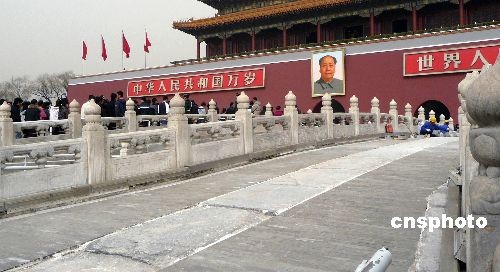 背景資料:為迎接新中國成立60周年,天安門管委會從2009年2月18日起對金水橋?qū)嵤┍Wo(hù)修繕,工程擬于2009年5月1日前完工,并整體對外開放。 中新社發(fā) 玉龍 攝