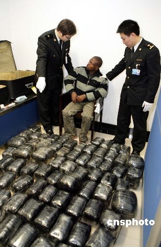 近日,北京首都機(jī)場(chǎng)海關(guān)在一男性旅客的行李中查獲毒品大麻可疑物72包,毛重87.25公斤。此案是首都機(jī)場(chǎng)海關(guān)旅檢現(xiàn)場(chǎng)今年首次查獲采用大批量客帶貨方式走私毒品入境案。嫌疑人在通關(guān)過(guò)程中采用極為少見(jiàn)的運(yùn)帶方式運(yùn)帶毒品。中新社發(fā) 雷虹 攝
