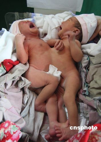 3月18日,躺在湖南省新化縣中醫(yī)院婦產(chǎn)科內(nèi)的連體嬰兒。16日,湖南省婁底市新化縣石沖口鎮(zhèn)紅寨村28歲的段曉艷在新化縣中醫(yī)院剖腹產(chǎn)下該市首例連體嬰兒。連體嬰兒都是女嬰,體重4.8公斤。面對(duì)這對(duì)連體女嬰,段曉艷一家人憂心忡忡,不知后期手術(shù)費(fèi)用如何籌措。目前,連體嬰兒已得到了首筆1000元的捐款。18日,湖南省兒童醫(yī)院的醫(yī)生將連體嬰兒接去長(zhǎng)沙市治療。 中新社發(fā) 郭國(guó)權(quán) 攝