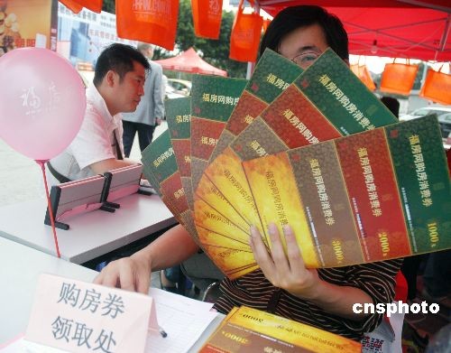 3月22日,由福州房地產協(xié)會聯合媒體和房地產商共同舉辦的發(fā)放購房消費券活動從3月20-23日開始向福州市民發(fā)放,消費券面額為1000至5000元不等,市民在指定的地點購房時出示消費券,可以獲得相等價格優(yōu)惠,消費券有效期為一個月。記者在現場看到,發(fā)放購房消費券并沒有得到市民的積極響應,與其它地方發(fā)放購房消費券市民排起長龍火爆放發(fā)相比,福州市民則反應冷清。中新社發(fā) 張斌 攝