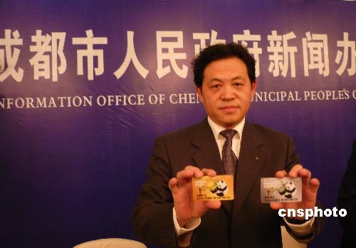 圖為成都市政府副秘書長鄧工力向媒體介紹發(fā)行的熊貓金卡和銀卡。3月24日,成都市將在成都11個(gè)景區(qū)對持有熊貓金卡的游客(配合本人身份證使用)實(shí)行免門票,對省內(nèi)持熊貓銀卡的游客實(shí)行門票半價(jià)優(yōu)惠。這次對省外游客發(fā)放熊貓金卡1500萬張,省內(nèi)發(fā)放熊貓銀卡500萬張。門票減免時(shí)間為即日到今年12月31日止。中新社發(fā) 王俊 攝