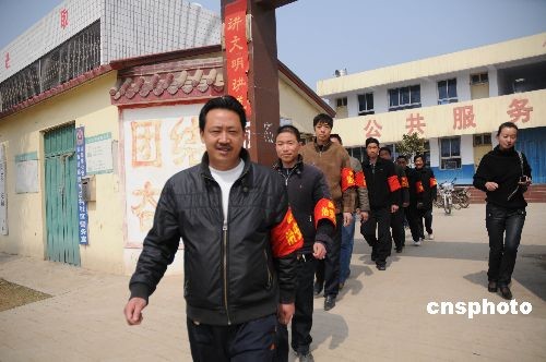 3月25日,兩支主要由返鄉(xiāng)農(nóng)民工和大學生村官組成的治安巡邏隊奔赴河南省南陽市臥龍區(qū)武候街道的城鄉(xiāng)“戰(zhàn)場”。去年以來,武候街道共吸納150名返鄉(xiāng)農(nóng)民工和大學生村官,組成城鄉(xiāng)治安巡邏隊,對城市社區(qū)和農(nóng)村鄉(xiāng)鎮(zhèn)實行24小時不間斷治安巡邏。巡邏隊員每人每月可獲得300元的崗位補助,而且,周六、周日和節(jié)假日還可享用二至三倍的加班費。 中新社發(fā) 付海厚 攝