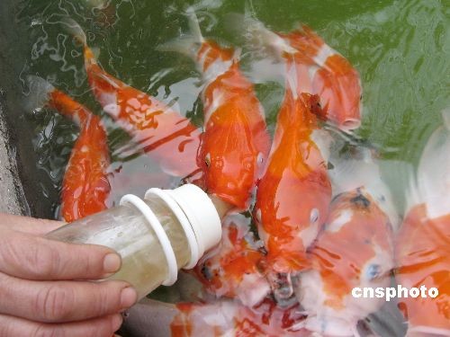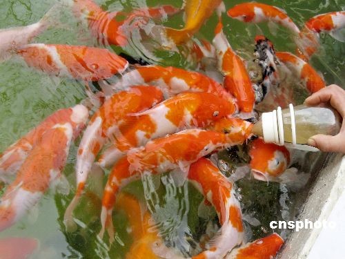 3月25日,在湖北宜昌公園,用奶瓶進(jìn)食的“吃奶魚”引來(lái)許多市民圍觀。該魚是原產(chǎn)日本的錦鯉,壽命在百歲以上,奶瓶裝的是高檔飼料。中新社發(fā) 韓玉洪 攝
