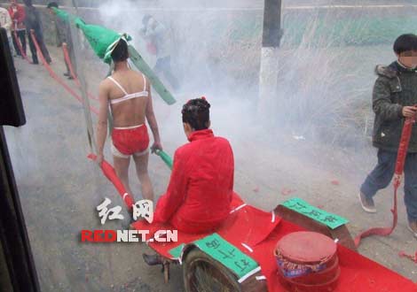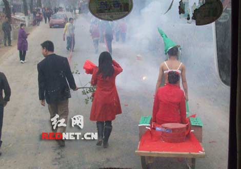 25日上午,網(wǎng)友“鍋爐工”在紅網(wǎng)論壇發(fā)帖,再現(xiàn)了一場“雷人”婚禮,帖子描述道“這男人扮牛頭,拉個‘投胎轉(zhuǎn)世車’拖著老婆回家,新娘后面放著幾掛鞭炮,據(jù)說是驅(qū)鬼用,拉著上‘奈何橋’好恐怖。