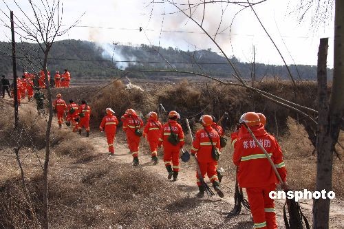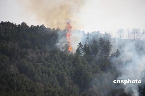 2009年3月28日下午2時(shí)左右,山西省盂縣東梁鄉(xiāng)東梁村騎龍山發(fā)生森林火災(zāi)。 森林火災(zāi)發(fā)生后,當(dāng)?shù)卣、公安、林業(yè)、醫(yī)務(wù)等部門第一時(shí)間趕到現(xiàn)場,組織滅火,并啟動了相關(guān)應(yīng)急預(yù)案。當(dāng)?shù)爻鰟訑?shù)百名干部群眾撲火,陽泉市武警也趕赴現(xiàn)場增援。由于火勢兇猛,在附近的村莊都能聽到火燒山林的聲音,山火的灰塵甚至飄到了最近的溫家山村。截至發(fā)稿時(shí),沒有人員傷亡報(bào)告。中新社發(fā) 程瑜 攝