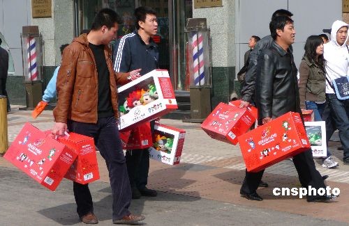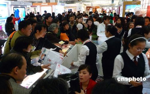 2009年3月31日,北京王府井奧運(yùn)特許商品店,顧客竟相搶購(gòu)各類(lèi)奧運(yùn)紀(jì)念品。當(dāng)日,手提大包小裹奧運(yùn)紀(jì)念品的人們成為金街一道靚麗風(fēng)景。按照相關(guān)規(guī)定,奧運(yùn)特許商品銷(xiāo)售日期截止到31日24時(shí)。北京一些大型商場(chǎng)內(nèi)的奧運(yùn)特許商品銷(xiāo)售點(diǎn)紛紛以超低價(jià)格進(jìn)行拋售。中新社發(fā) 玉龍 攝
