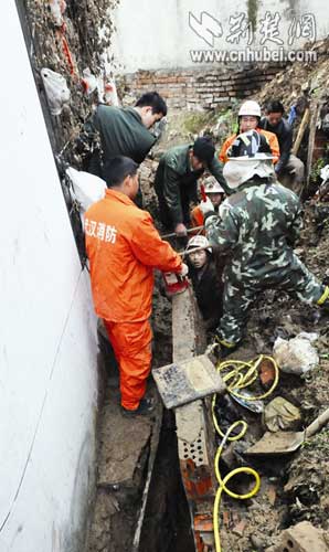 為保證被困人員安全同時防止第二次塌方,消防員迅速找來四根粗大的木料,將周邊松動的水泥墻死死頂住。實施救援時,消防員首先嘗試用風鎬鑿碎溝底的水泥管,幾分鐘后很快鑿穿,不料余師傅的右腿依然動彈不得;接著找來兩個氣墊,通過腳踩增壓,以求擴大余師傅右腿所在的空間,結(jié)果效果不理想;繼而又找來千斤頂,還是無濟于事。發(fā)現(xiàn)只有吊起坍塌的墻體,才能從根本上解決問題。于是調(diào)來吊車,隔著院墻伸出吊臂,正好坍塌墻體上有個排水孔,消防員設法將鋼絲繩繞過了排水洞。吊車司機小心翼翼地操作,既要減輕被夾者的痛苦,又要繞過坍塌現(xiàn)場的線纜,而且盡可能在起吊過程中確保墻體不能斷裂。幸好,起吊墻體四周泥土較為松軟,11時20分左右,墻體被成功吊起,消防戰(zhàn)士迅速將余師傅抱出水溝。劉蔚丹 饒純武 黃康 攝
