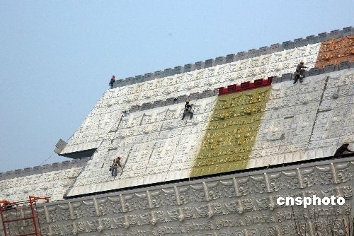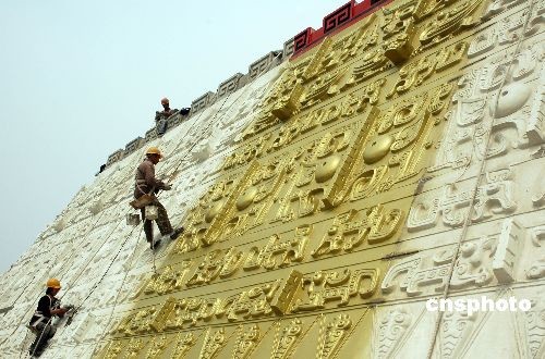 4月5日,河南省安陽市中國文字博物館建設(shè)現(xiàn)場(chǎng),建設(shè)者們?cè)谶M(jìn)行施工。中國文字博物館自2007年在安陽市正式開工建設(shè)以來,各項(xiàng)建設(shè)工作正在有條不紊地向前推進(jìn),2009年底有望開館。據(jù)悉,建成后的中國文字博物館由字坊、廣場(chǎng)、主體館、倉頡館、科普館、研究中心、交流中心等建筑組成,將是世界上第一家以文字為主題的國家級(jí)專業(yè)博物館。中新社發(fā) 常中正 攝