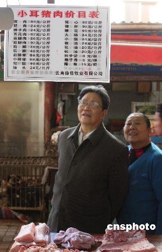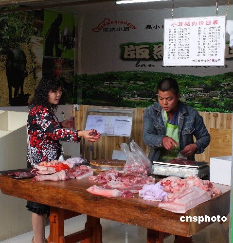近日,產(chǎn)自云南西雙版納的珍稀品種小耳豬在昆明上市,每公斤瘦肉標價九十八元,被市民稱為“天價”豬肉。版納小耳豬具有2000多年歷史,是全國唯一由本土野豬馴化而來的本地豬種,2002年被列入《國家級畜禽品種資源保護名錄》,由西雙版納當?shù)厣贁?shù)民族在原始森林放養(yǎng),是真正的“生態(tài)豬肉”。甫一上市,便受到不少昆明市民的青睞。圖為來購買小耳豬肉的昆明市民。中新社發(fā) 劉冉陽 攝