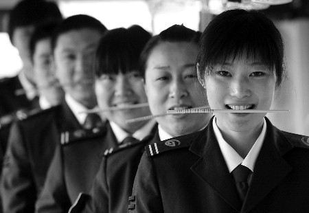 15日,濟(jì)南10路公交車駕駛員咬著筷子練習(xí)微笑服務(wù)。當(dāng)日,為給乘客提供微笑服務(wù),該車隊(duì)對(duì)駕駛員進(jìn)行“笑臉迎全運(yùn)”培訓(xùn),按照標(biāo)準(zhǔn)進(jìn)行練習(xí),要求只能露出6到8顆牙齒,為達(dá)要求,司機(jī)在訓(xùn)練微笑時(shí),都會(huì)咬著一根筷子。(本報(bào)記者 王鴻光 通訊員 吳林 攝)