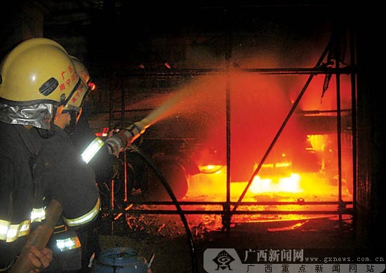 4月16日晚8時(shí)許,在南寧市仙葫開發(fā)區(qū)東方外國語學(xué)院的工地上,一輛灌漿車不明起火,引燃了油箱。經(jīng)消防隊(duì)員一個多小時(shí)的撲救,大火在當(dāng)晚9時(shí)30分才被完全撲滅。