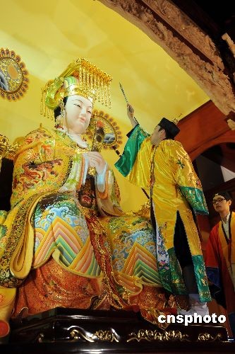 4月18日,是“天上圣母”媽祖誕辰1049年紀(jì)念日。經(jīng)兩年多時(shí)間復(fù)建的福州馬尾船政天后宮亦于當(dāng)日舉行媽祖金身開光大典儀式后,正式對信眾及游人免費(fèi)開放。媽祖塑像是由福建莆田籍著名工藝美術(shù)大師佘國平設(shè)計(jì)并建造完成。塑像采用福州傳統(tǒng)脫胎漆器工藝,所有彩繪均使用礦物彩,可經(jīng)千年不褪;手工按金工藝,其光澤度足以和鍍金相媲美。中新社發(fā) 鄭祚聲 攝