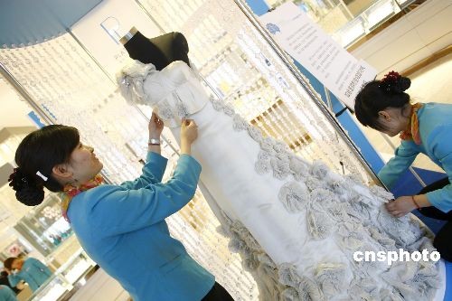 4月26日,世界上僅三件的鉑金婚紗之一亮相北京國華商場,上面墜滿了由鉑金絲線和鉑金珠子縫制的白色花朵,吸引不少顧客的目光。這件價(jià)值75萬美元(約合500多萬人民幣)的“金貴”婚紗,是由國際鉑金協(xié)會(huì)邀請(qǐng)世界著名設(shè)計(jì)師Vivienne Tam經(jīng)過近一年時(shí)間的創(chuàng)作完成,她巧妙地將中西文化相融合,大膽地將中國的國花——牡丹作為創(chuàng)意元素。圖為工作人員正在整理鉑金婚紗。中新社發(fā) 鄭雄增 攝