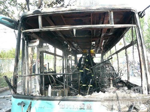 記者趕到現(xiàn)場時,火勢已經(jīng)被基本控制,多名消防隊員還在噴水撲滅余火,現(xiàn)場彌漫著濃烈的焦糊味。記者看到,該輛公交車已被燒得面目全非,僅剩下了一個鐵骨架,后側(cè)輪胎也已被燒得爆裂。