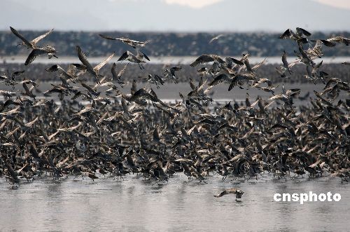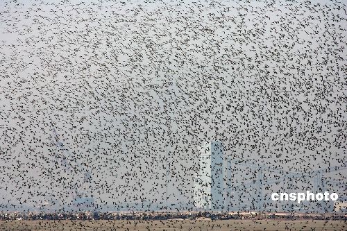 2009年4月27日,百萬(wàn)只候鳥(niǎo)在遼寧省東港市鴨綠江口濕地上空盤(pán)旋,蔚為壯觀。鴨綠江口濕地是世界上最大、最重要的鳥(niǎo)類遷徒地,每年的4月中旬至5月中旬,將會(huì)近百種超過(guò)百萬(wàn)只候鳥(niǎo)群從澳大利亞、新西蘭等地飛抵這里棲息,然后飛往俄羅斯西伯利亞、美國(guó)阿拉斯加進(jìn)行繁殖。中新社發(fā) 盧沙 攝