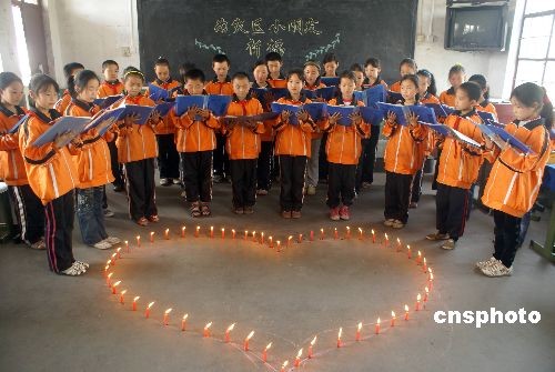4月29日,河南省濟(jì)源市紙坊小學(xué)學(xué)生點(diǎn)燃紅蠟燭為四川地震災(zāi)區(qū)小朋友祈福。在汶川地震一周年即將來臨之際,河南省濟(jì)源市紙坊小學(xué)舉行“為災(zāi)區(qū)小朋友祈福”主題班會(huì),大家點(diǎn)燃紅蠟燭,獻(xiàn)上飽含深情的詩歌,為四川地震災(zāi)區(qū)小朋友祈福平安。中新社發(fā) 平白 攝