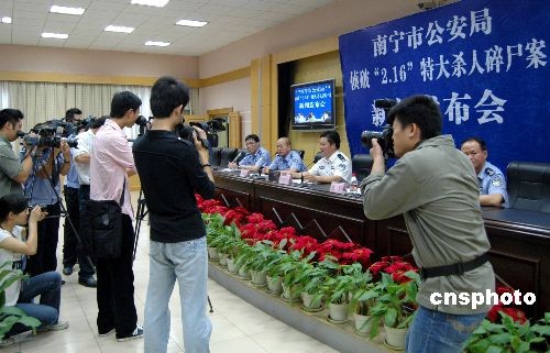 四月三十日,轟動廣西首府南寧市的“覃氏三姐妹慘遭碎尸”案宣布告破,南寧市公安局就此舉行新聞發(fā)布會。二00九年二月十二日,家住南寧市西鄉(xiāng)塘區(qū)的覃女士向公安機關報案,稱其住嘉州華都小區(qū)的三個妹妹在二月十日晚失蹤。十六日,公安機關在南寧郊區(qū)發(fā)現(xiàn)多個散發(fā)惡臭的袋子,所裝之物為被肢解的尸塊,經(jīng)法醫(yī)鑒定,屬失蹤的三姐妹。南寧市公安局官員在發(fā)布會上介紹,犯罪嫌疑人蘭某乃三姐妹對門的鄰居,因工作及感情生活不如意等,欲強奸女性宣泄欲望,事后怕行徑敗露,蘭某遂一一殺死覃氏三姐妹并肢解拋尸郊外荒野。中新社發(fā) 王剛 攝