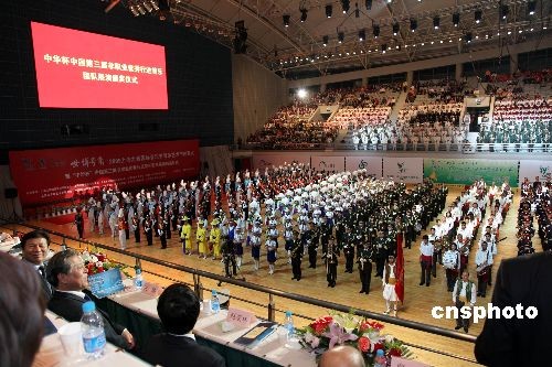 5月2日晚,在國內(nèi)外眾多管樂隊共同吹響的歡樂頌中,世博號角——2009上海之春國際音樂節(jié)管樂藝術(shù)節(jié)暨“中華杯”中國第三屆非職業(yè)優(yōu)秀行進(jìn)管樂團(tuán)展演圓滿閉幕。在藝術(shù)節(jié)期間還舉行了行進(jìn)管樂論壇,與會嘉賓就促進(jìn)全世界行進(jìn)管樂團(tuán)的發(fā)展舉行了會談。中新社發(fā) 黃寧 攝