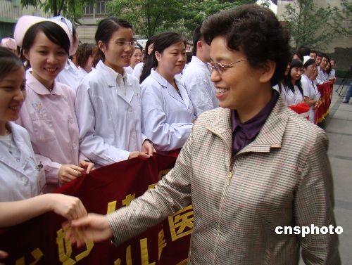 5月8日下午,來(lái)自四川省人民醫(yī)院、四川大學(xué)華西醫(yī)院、四川省腫瘤醫(yī)院等20余所醫(yī)院的醫(yī)務(wù)工作者,在抗震救災(zāi)周年期間開赴災(zāi)區(qū)進(jìn)行為期10天的醫(yī)療衛(wèi)生服務(wù)。據(jù)了解,本次醫(yī)務(wù)工作者進(jìn)災(zāi)區(qū)開展醫(yī)療衛(wèi)生服務(wù)分為3個(gè)批次,將在都江堰、青川、北川等極重災(zāi)區(qū)開展醫(yī)療義診、防疫保健、對(duì)口醫(yī)療技術(shù)職員以及抗震救災(zāi)醫(yī)療衛(wèi)生系統(tǒng)先進(jìn)事跡宣傳活動(dòng)。圖為中共四川省委常委李登菊慰問(wèn)即將開赴災(zāi)區(qū)的醫(yī)療工作者。中新社發(fā) 王萌 攝