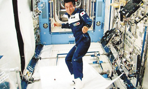 日本宇航員若田光一在國際空間站上由日本建造的“希望”號實驗艙內(nèi)試驗了毯上飛行以及零重力條件下滴眼藥水等。據(jù)報道,日本宇宙航空研究開發(fā)機構已將若田5月15日的“飛毯”表演視頻公之于眾。畫面顯示,現(xiàn)年45歲的若田站在一塊白色布單上,就像單板滑雪一樣平穩(wěn)地滑過國際空間站上的一個實驗艙。若田通過麥克風說:“我在這個‘魔毯’飛行中使用膠帶固定雙腳,以便能站在上面!